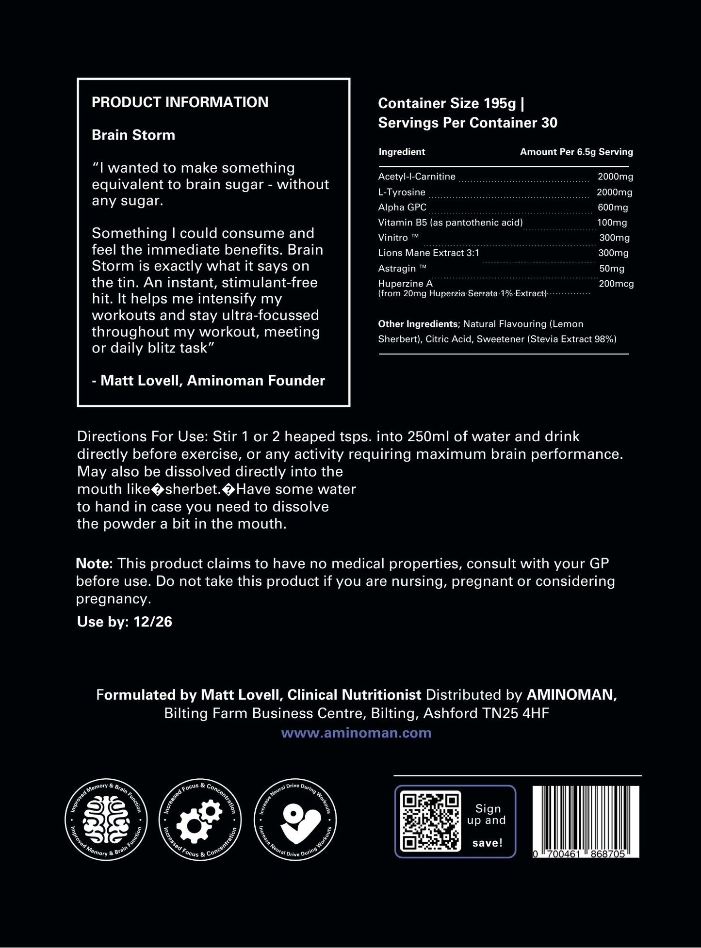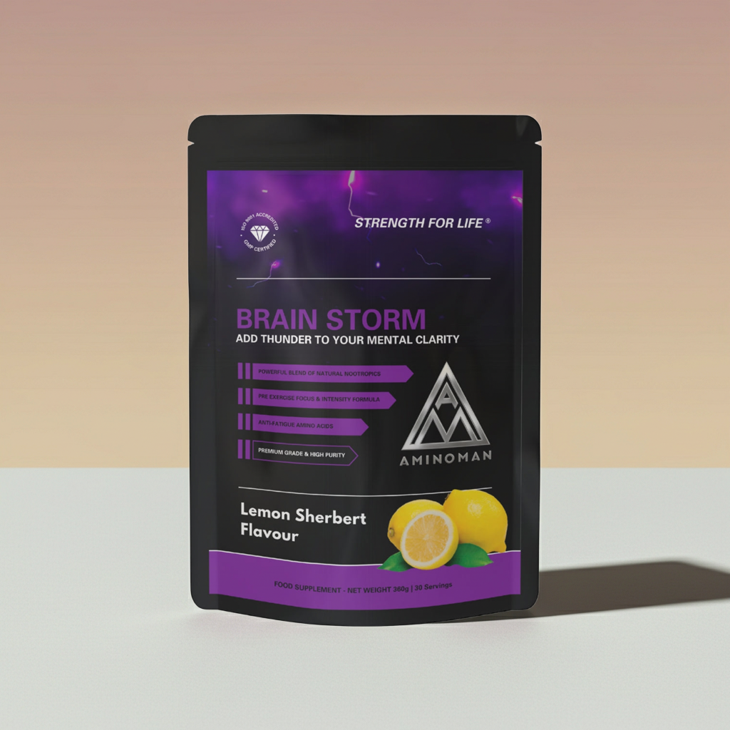 Packaged in a 180g pouch (30 servings), Brain Storm is designed for convenience and versatility. It can be mixed with water or even taken directly as a sherbet-style powder. As with all Amino Man products, Brain Storm is a food supplement (not a medicine) carefully formulated to complement your health and training goals.