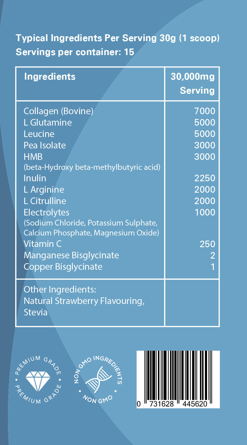 Each serving delivers 7,000mg of hydrolysed bovine collagen, combined with key amino acids to maximise protein synthesis and support gut health. A powerful 5,000mg of L-Glutamine and 5,000mg of Leucine further enhance muscle recovery, while 3,000mg of HMB supports anti-catabolic effects and tissue regeneration.