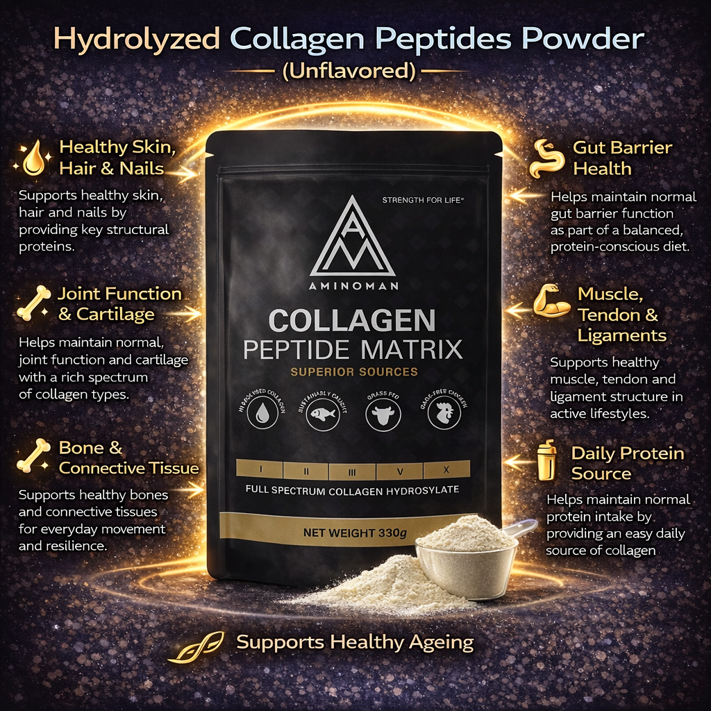 Created for users who value clarity, quality and consistency, Amino Man Collagen Peptide Matrix offers a straightforward way to support healthy skin, joints, bones and connective tissues as part of a balanced lifestyle.