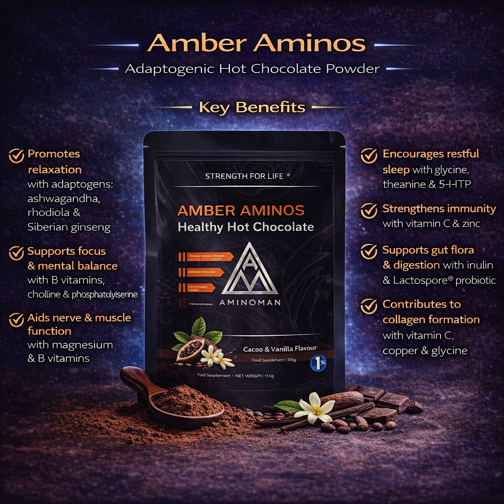 Amber Aminos is a luxurious adaptogenic hot chocolate crafted to elevate your evening routine with a blend of organic cacao, clinically researched adaptogens, calming amino acids, essential minerals, and gut-supportive nutrients. Designed for those who value both comfort and performance, it offers a rich, indulgent flavour profile while supporting relaxation and overall wellbeing at the end of a full day.