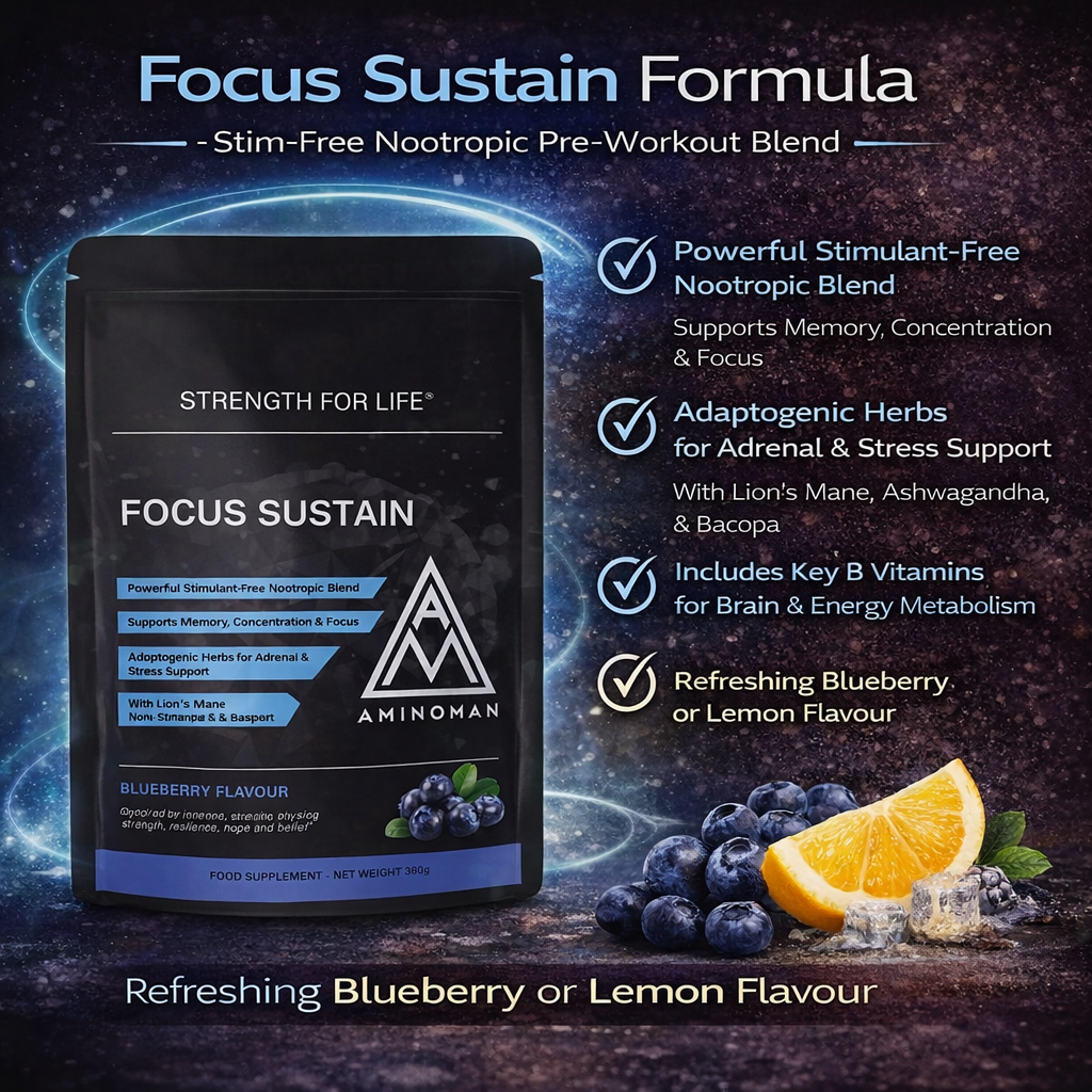 Amino Man Focus Sustain is a caffeine free, stimulant-free nootropic powder formulated to support mental clarity, focus, and everyday cognitive performance. It is designed for individuals who want reliable mental support without relying on caffeine or high-stimulant formulas. This makes it suitable for use at any time of day, including alongside training, work, or study routines.