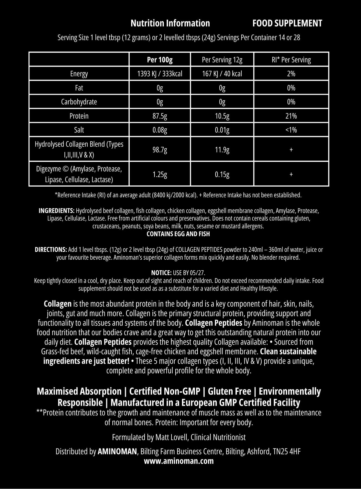 Collagen Peptide Matrix is free from GMOs, gluten, artificial colours and preservatives, and is produced in a GMP-certified European facility. Packaging is fully recyclable to support environmentally responsible choices.