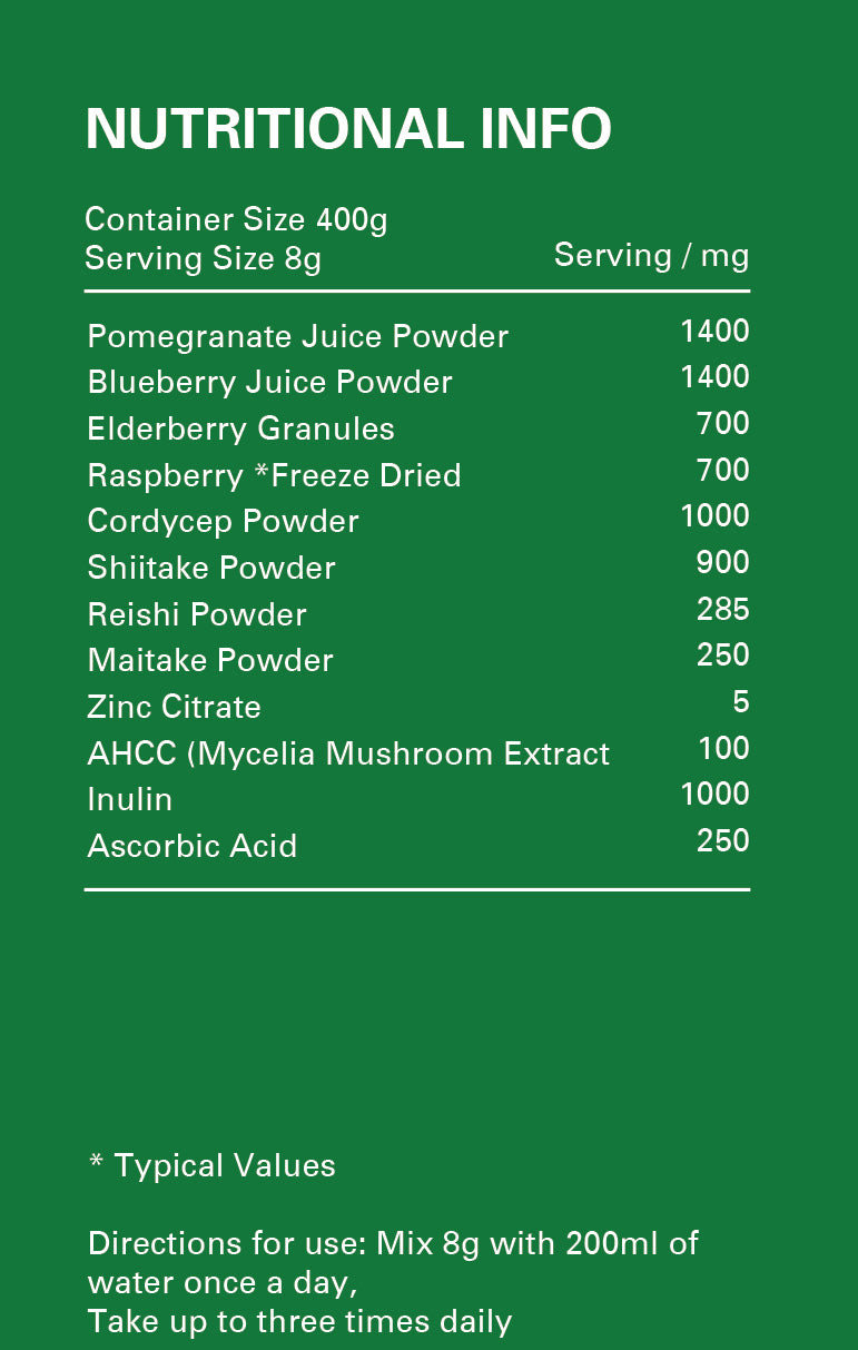 Each scoop delivers a comprehensive mix of pomegranate, blueberry, elderberry, and raspberry powders, combined with four powerful mushrooms: Cordyceps, Shiitake, Maitake, and Reishi. These ingredients are widely recognised for their immune-modulating properties, helping stimulate natural killer (NK) cells and supporting the adaptive immune response.